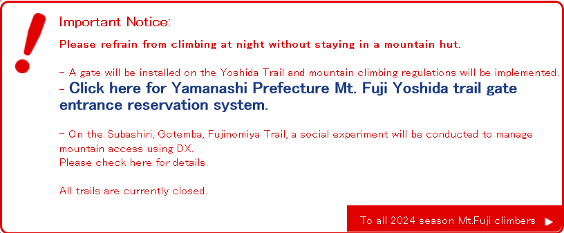 Yes: There are a lot of huts along the four possible hiking trails. They should be contacted very early on. After arriving at the 5th station, you can relax and hike to the 6th or 7th station and move into your bed. - Which path or route do you want to take? There are four different paths you can use. Yoshida Trail (this trail is closed for overnight walks now!, take one of the others: Subashiri Trail, Gotemba Trail and Fujinomiya Trail. We chose the Yoshida Trail, like more than half of all hikers. This route is considered relatively easy and has good infrastructure.